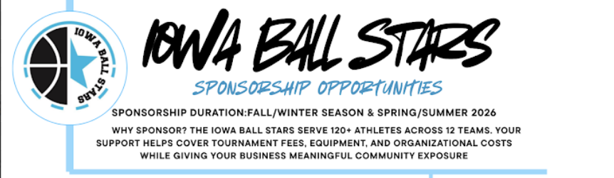 We are grateful for the generous support of our sponsors who make Iowa Ball Stars possible. Their contributions help provide opportunities for young athletes to grow both on and off the court—developing skills, teamwork, and confidence that last a lifetime. By investing in our program, sponsors play a vital role in ensuring that every player has access to quality coaching, equipment, and competitive experiences. We are proud to partner with businesses and individuals who believe in empowering the next generation through basketball. Thank you for helping us build a stronger community and brighter future for our youth.